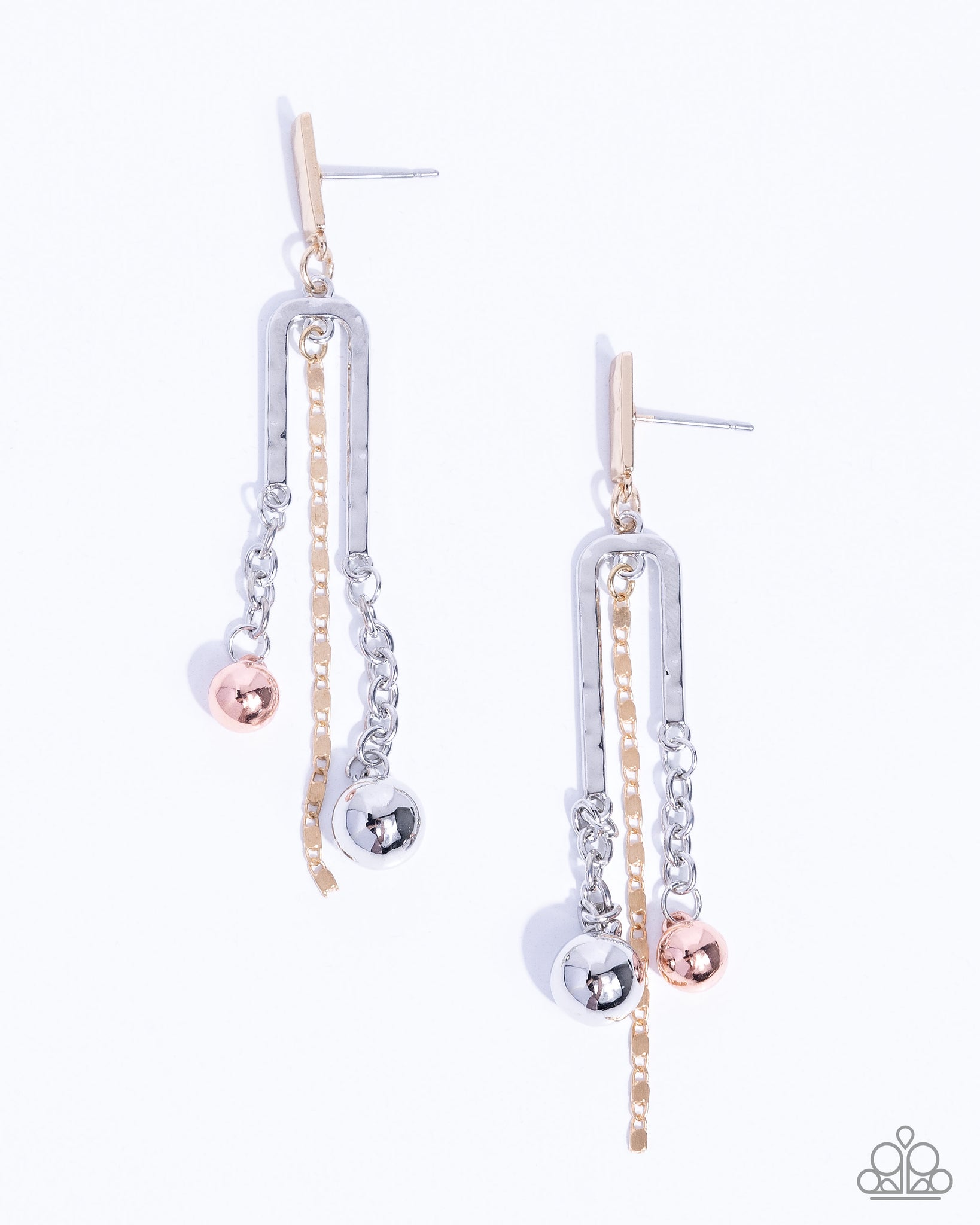 Featuring a delicately hammered finish, a rectangular vertical gold fitting gives way to an unfinished hammered silver cylindrical frame. Silver and shiny copper beads cascade from the ends of the unfinished frame in varying lengths while a dainty textured gold chain sways from the middle of the frame for a tapered, trailblazing lure. Earring attaches to a standard post fitting.