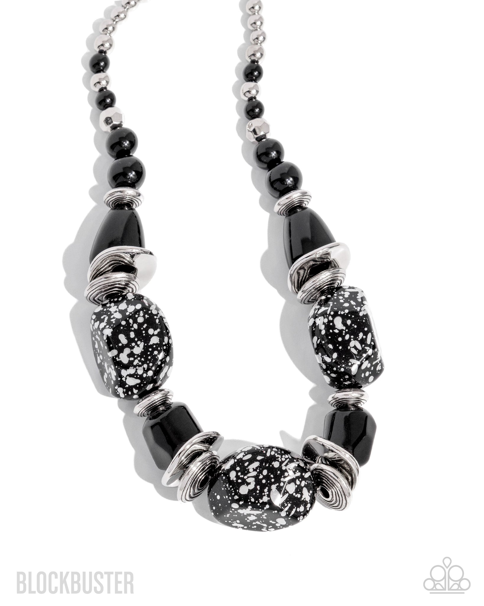 Infused along an invisible string, a collection of abstract chunky black beads with speckles of silver and a gorgeous glazed finish alternate with solitaire abstract black beads, round black pearls, silver beads, doubled layers of thick textured silver rings, and defaced silver beads, creating an eye-catching, engaging display along the neckline. Features an adjustable clasp closure.