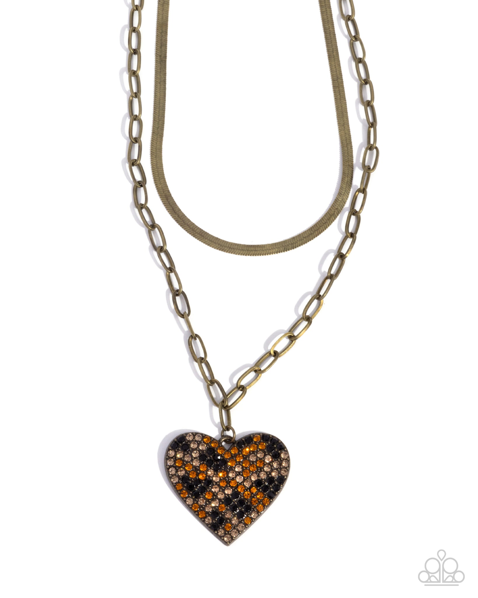 Featuring a cheetah-inspired pattern made up of tea, topaz, and black rhinestones, an oversized brass heart sways below a brass paperclip chain and a layered brass herringbone chain for a whimsically wild look. Features an adjustable clasp closure.