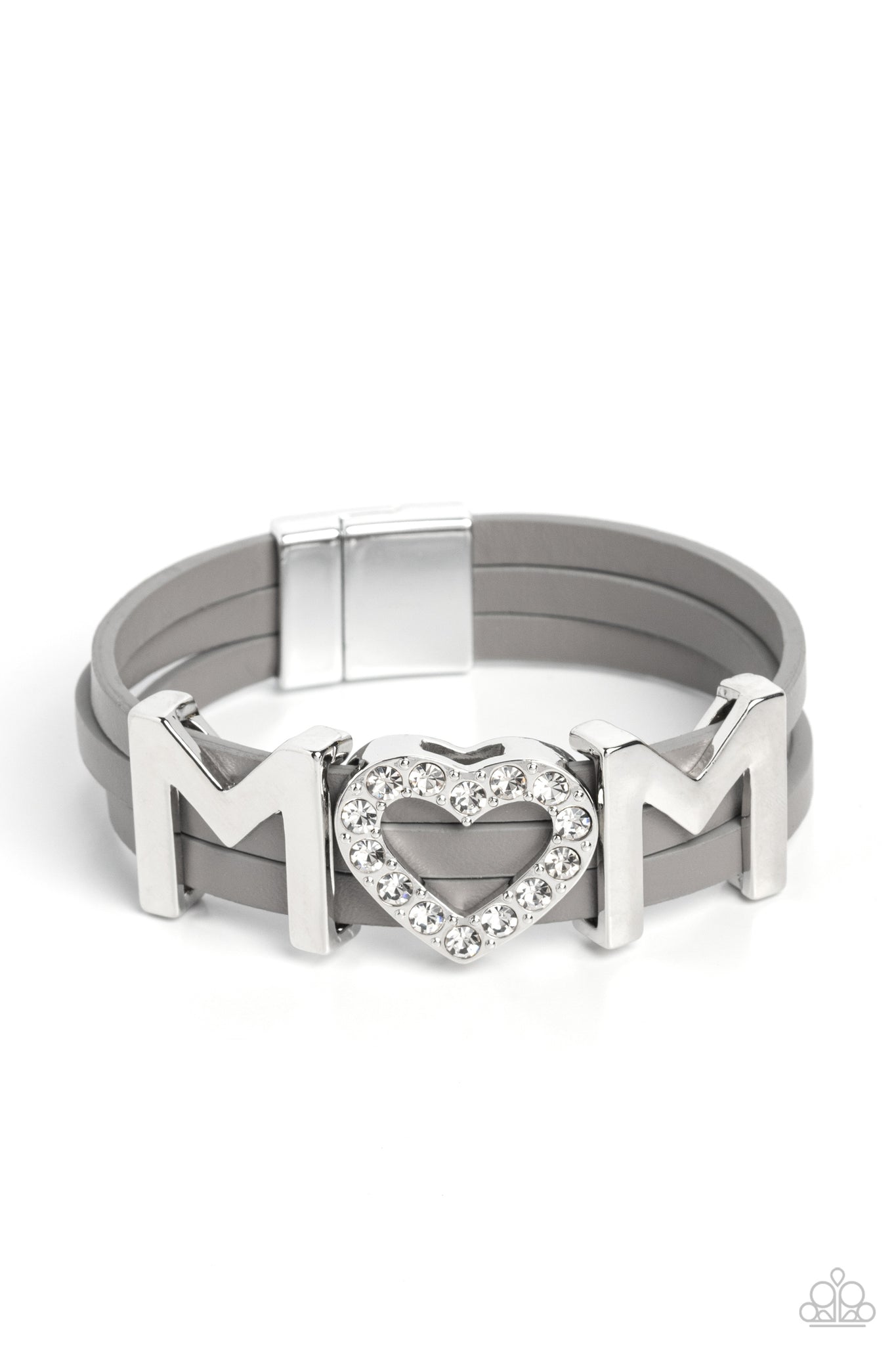 A row of glassy white rhinestones are encased into a sparkly heart frame that is threaded along layers of gray leather strands around the wrist. Framing both sides of the heart frame, two high-sheen silver letter "M"s spell out the word "mom" atop the wrist for a sentimental finish. Features a magnetic closure.