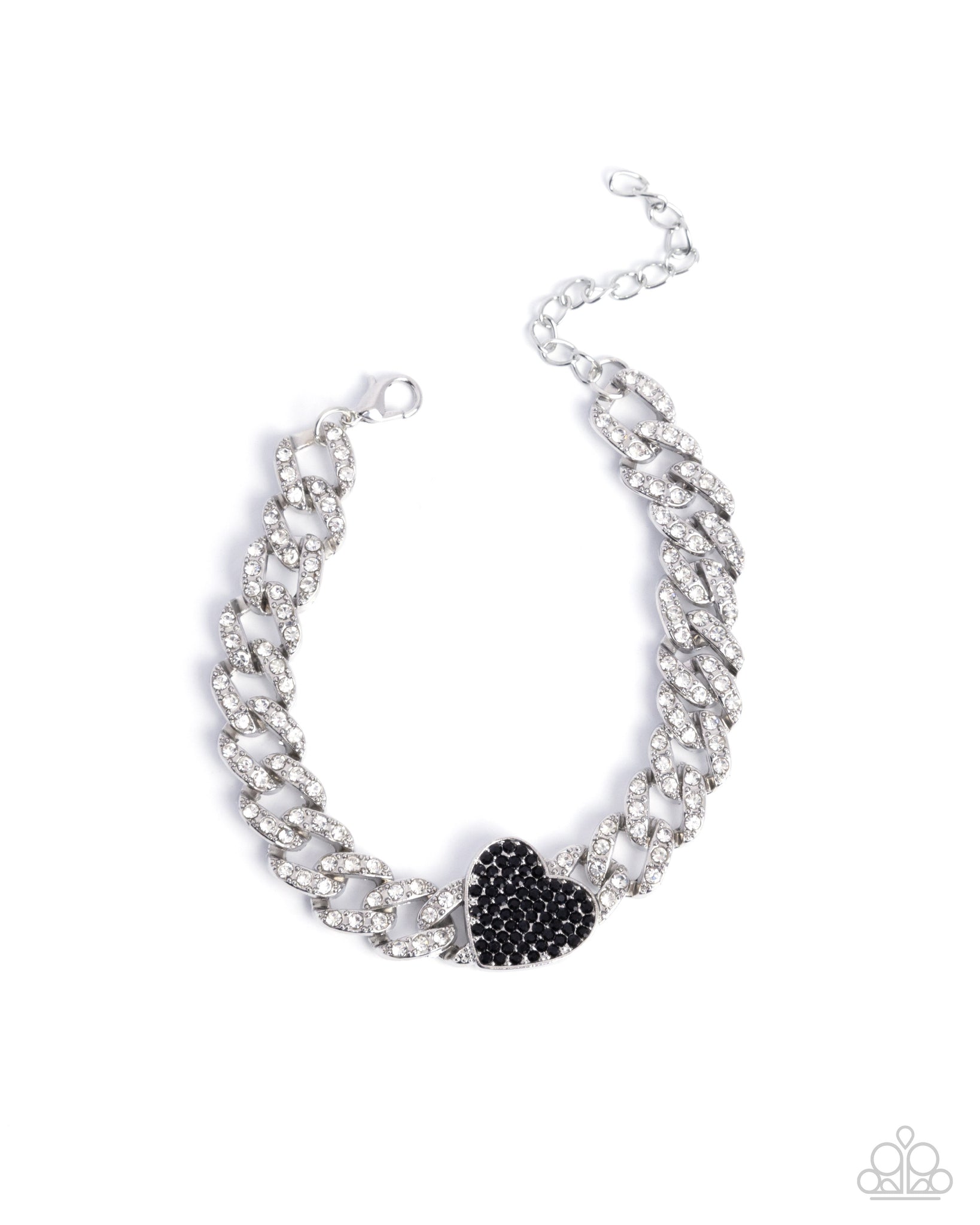A chunky silver chain is embellished with glittering white rhinestones along its interlocking links. At the center, a heart-shaped pendant encrusted with black rhinestones adds a bold contrast to the design. Features an adjustable clasp closure.