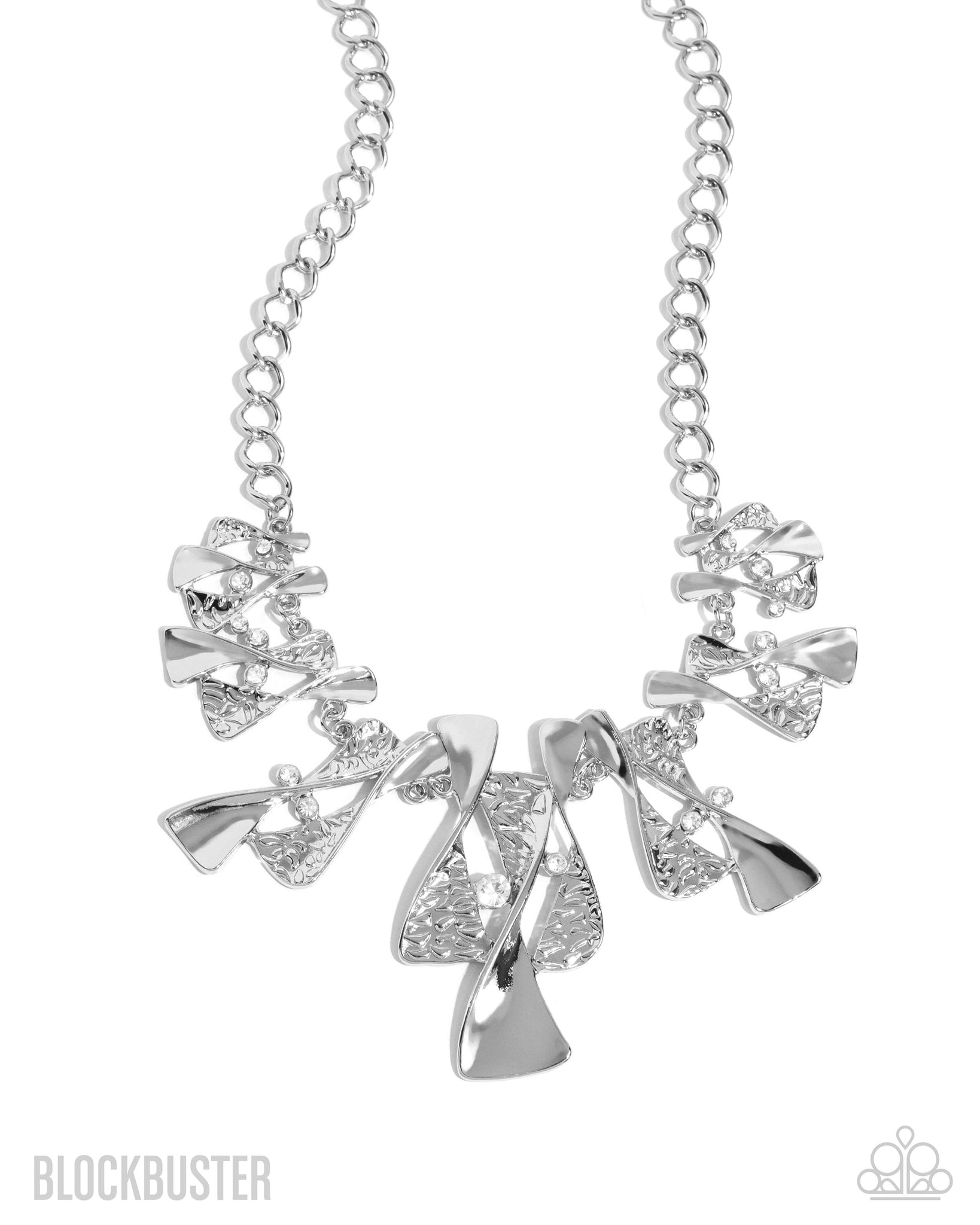 Embellished along a chunky silver chain, twisted hourglass-like shapes, half hammered in texture gradually increase in size as they get to the center of the design for an elegantly esteemed look. Dainty white rhinestones are randomly interspersed along the shapes, adding dazzling depth to the design. Features an adjustable clasp closure.