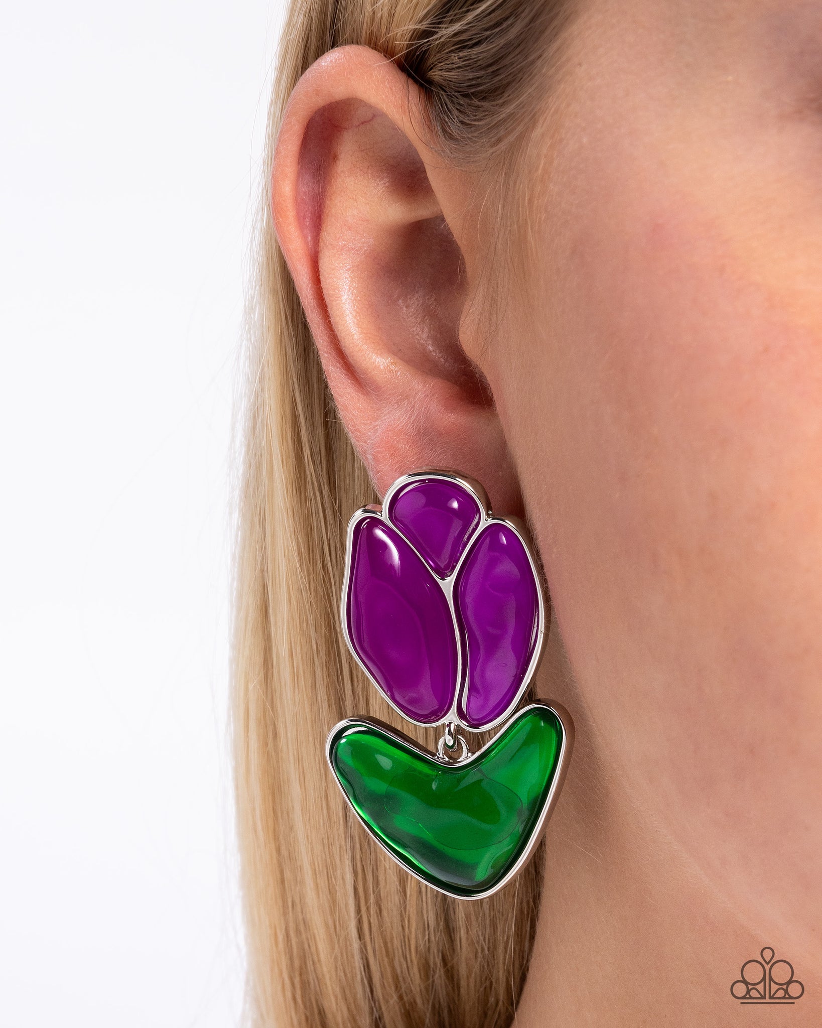 Featuring a tulip-motif, glassy Plum acrylic petals bloom from a green acrylic stem for a whimsical lure. Earring attaches to a standard post fitting.