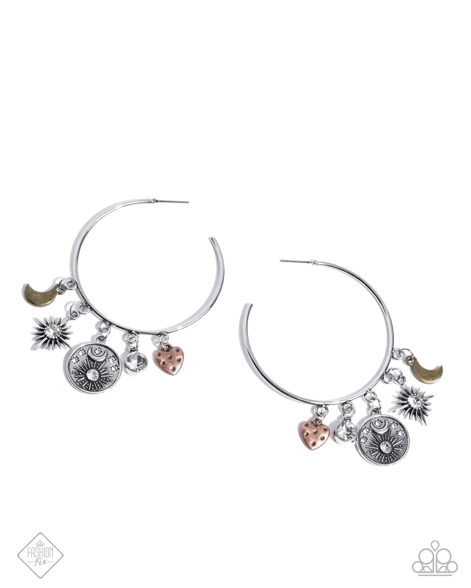 Attached along an oversized silver hoop, a collection of whimsical charms including a brass crescent moon, a white rhinestone-dotted three-dimensional silver star, a star, moon, and sun-embellished silver pendant, a solitaire white rhinestone, and a hammered copper heart swing along the ear for an elegantly eclectic arrangement. Earring attaches to a standard post fitting. Hoop measures approximately 2" in diameter.